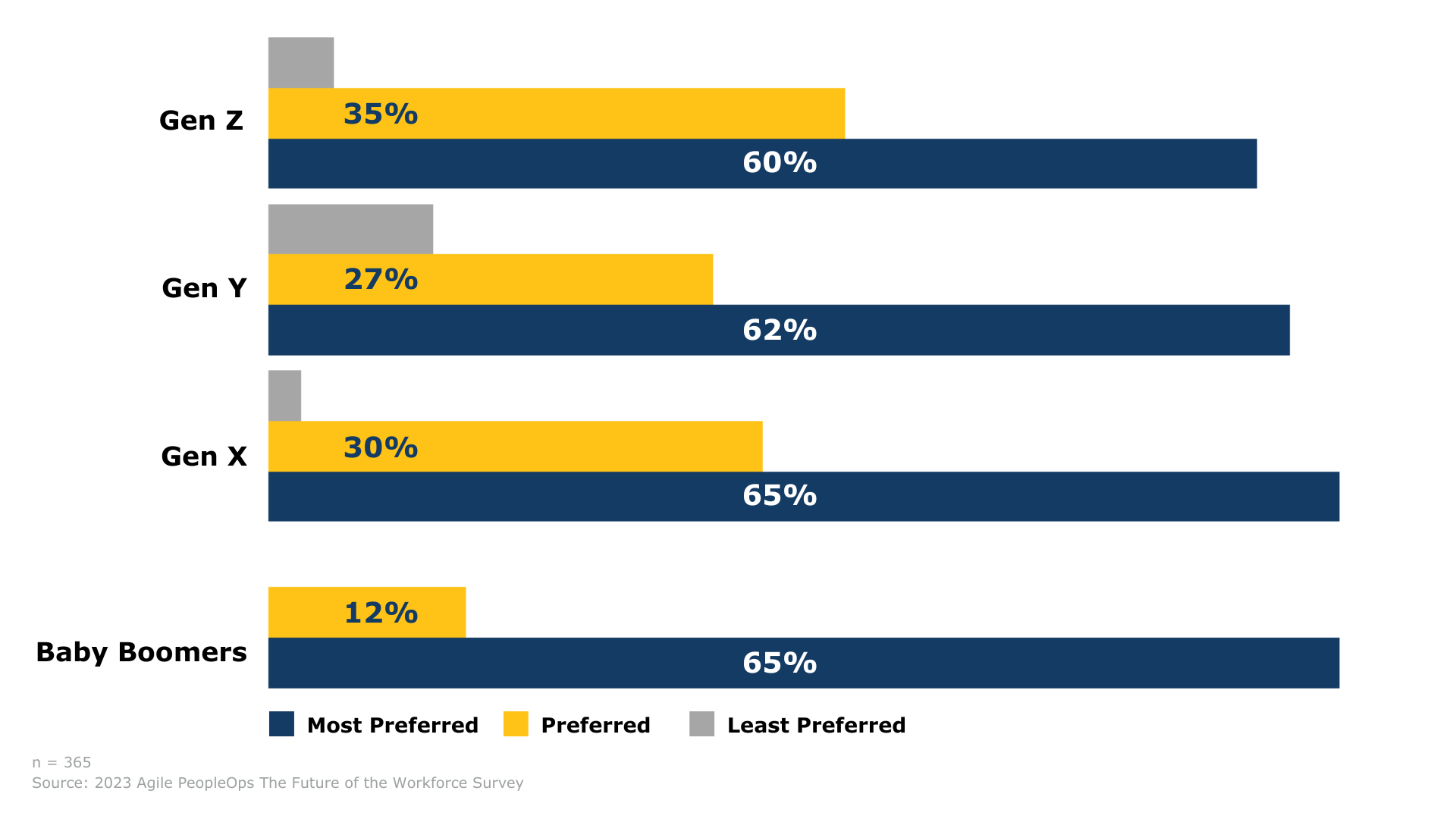 Interestingly, younger generations (Gen Z and Millennials) showed more varied responses—registering higher in both the Preferred and Least Preferred categories. What does this suggest?