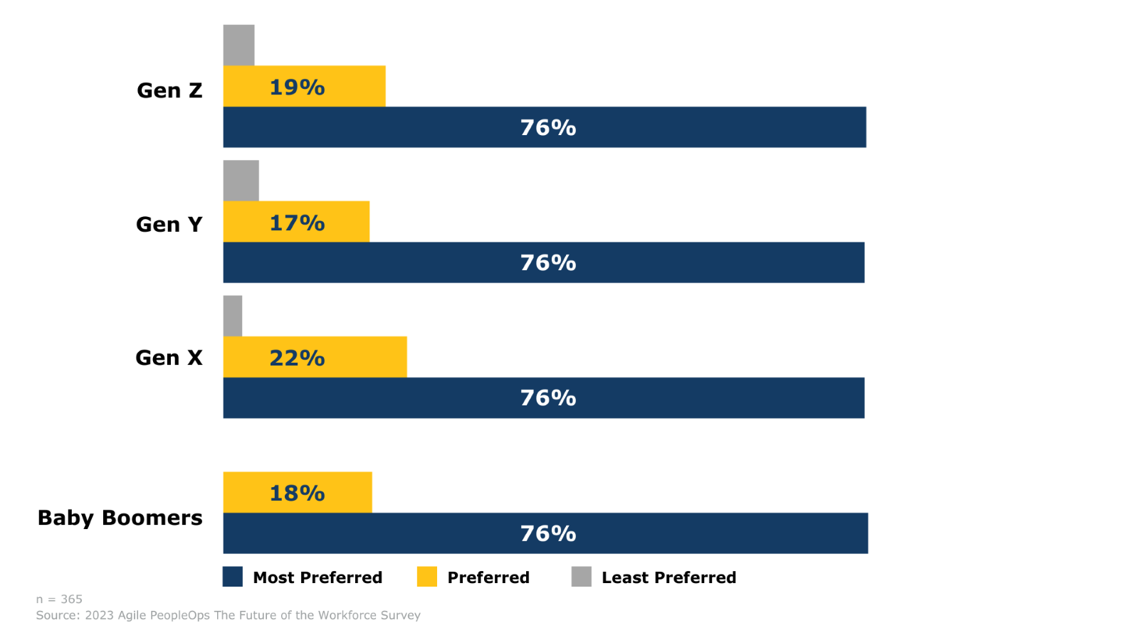 After analyzing workforce preferences across Baby Boomers, Gen X, Millennials, and Gen Z, we uncovered something remarkable: 76% of workers across ALL generations rank a “great team environment” as their most preferred workplace element.
